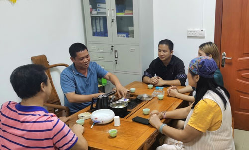 梁计源副会长(泡茶者)、潘晓顾问(左一)、光蓓总监(戴头巾者)、玉清清副主任、策划小韦(黑衣者)参加筹备会议