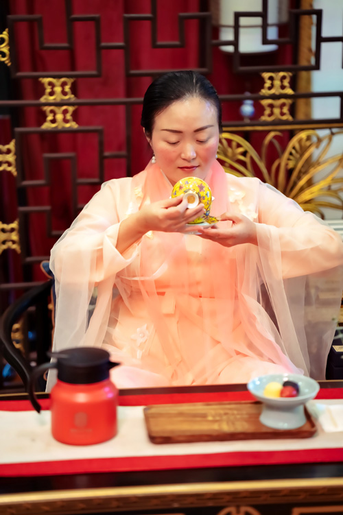 这次宫廷茶宴的主讲嘉宾是满庭芳•女子文化学苑联合创始人、得馨女子茶学堂创始人,国家二级茶艺技师,国家茶艺竞赛裁判员 ,考评员,茶艺教师,茶疗师,芳香调理师,国际礼仪师周霞老师。首先她为现场的嘉宾们介绍了珐琅彩盖碗茶具及其标准的品茶礼仪;随后用柑橘和薄荷精油,安神静心;品茶环节,与茶会主题“被茶疗愈的时光”对应,周霞老师带来卢仝的七碗茶独特的饮茶方式,结合道家养生呼吸法、打坐、冥想…以这种方式饮茶过程中快速打通身体微循环,疏通经络,达到调理身体和愉悦心情的作用。